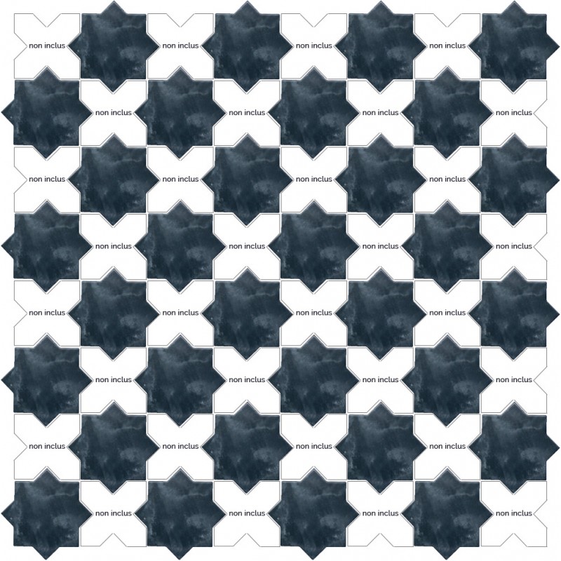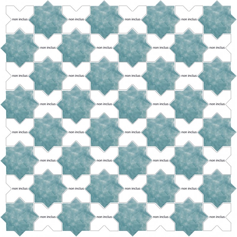 Carrelage de faïence pâte blanche de dimension 13,6x13,6 cm en forme d'étoile, épaisseur 9 mm, bords droits non rectifiés.